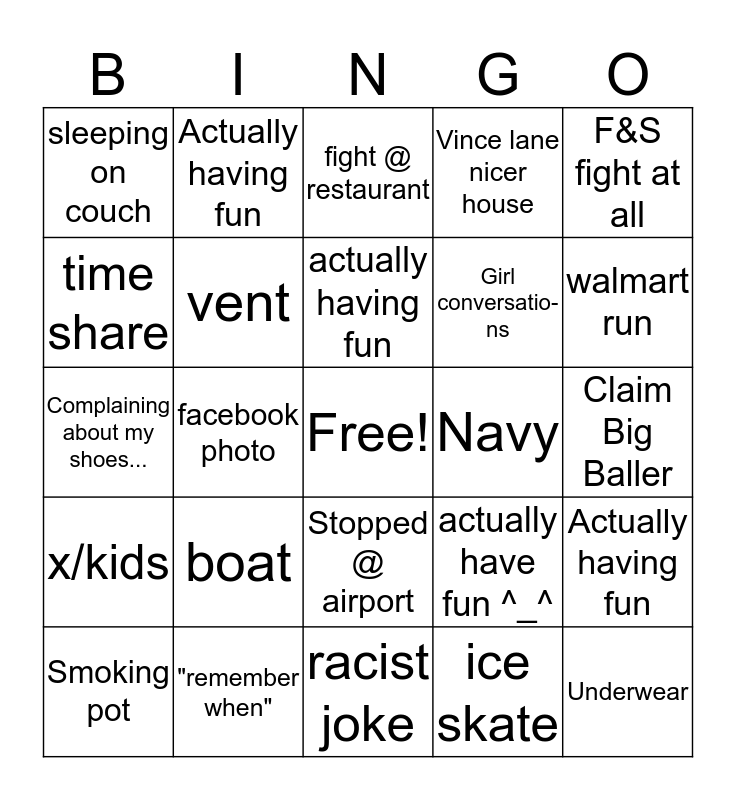 This bingo card has a free space and 29 words: Smoking pot, No switch games/ Switch lite, facebook photo, waffle house, sleeping on couch, fight @ restaurant, vent, boat, Navy, "remember when", Claim Big Baller, Underwear, racist joke, ice skate, walmart run, Osu, UC, Figuring it out, Stopped @ airport, x/kids, F&S fight at all, Complaining about my shoes..., actually have fun ^_^, not flushing toilet, Girl conversatio-ns, time share, Vince lane nicer house, Actually having fun, Actually having fun, actually having fun and actually having fun.