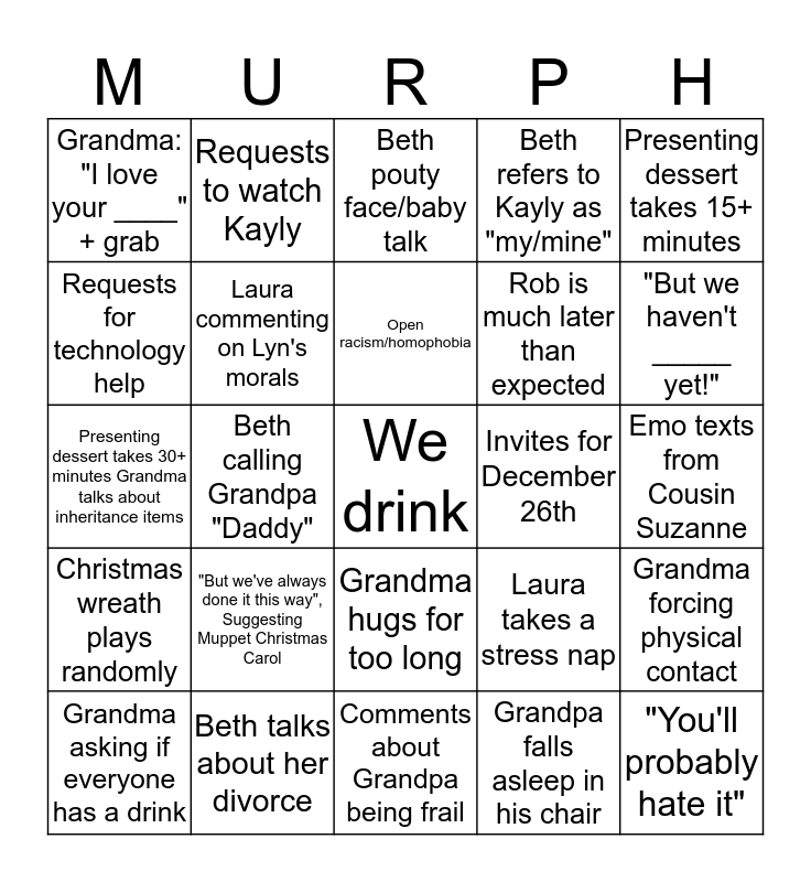 This bingo card has a free space and 29 words: Grandma asking if everyone has a drink, Reference to present fort, Beth calling Grandpa "Daddy", Grandma forcing posed photos, Grandma: "I love your ____" + grab, Beth pouty face/baby talk, Laura commenting on Lyn's morals, "But we've always done it this way", Suggesting Muppet Christmas Carol, Invites for December 26th, Beth talks about her divorce, Emo texts from Cousin Suzanne, "You'll probably hate it", Comments about Grandpa being frail, Grandpa falls asleep in his chair, "But we haven't _____ yet!", Listing all available food items, Grandma hugs for too long, Christmas wreath plays randomly, Presenting dessert takes 15+ minutes, Presenting dessert takes 30+ minutes Grandma talks about inheritance items, Laura takes a stress nap, Literally everyone on their phone, Rob is much later than expected, Requests for technology help, Beth refers to Kayly as "my/mine", Requests to watch Kayly, Grandma forcing physical contact, Open racism/homophobia and Discussing vague plans to visit MD.