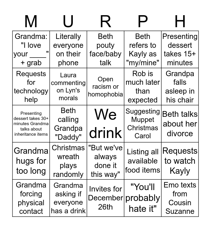 This bingo card has a free space and 30 words: Grandma asking if everyone has a drink, Reference to present fort, Beth calling Grandpa "Daddy", Grandma forcing posed photos, Grandma: "I love your ____" + grab, Beth pouty face/baby talk, Laura commenting on Lyn's morals, "But we've always done it this way", Suggesting Muppet Christmas Carol, Invites for December 26th, Beth talks about her divorce, Emo texts from Cousin Suzanne, "You'll probably hate it", Comments about Grandpa being frail, Grandpa falls asleep in his chair, "But we haven't _____ yet!", Listing all available food items, Grandma hugs for too long, Christmas wreath plays randomly, Presenting dessert takes 15+ minutes, Presenting dessert takes 30+ minutes Grandma talks about inheritance items, Laura takes a stress nap, Literally everyone on their phone, Rob is much later than expected, Requests for technology help, Beth refers to Kayly as "my/mine", Requests to watch Kayly, Grandma forcing physical contact, Open racism or homophobia and Discussing vague plans to visit MD.