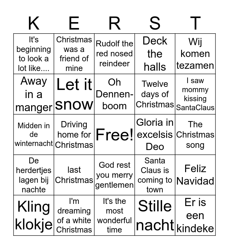 This bingo card has a free space and 29 words: Jingle bells, I'm dreaming of a white Christmas, Rudolf the red nosed reindeer, Flappie, Wij komen tezamen, It's beginning to look a lot like...., Let it snow, Oh Dennen-boom, Gloria in excelsis Deo, Feliz Navidad, Kling klokje, Driving home for Christmas, Stille nacht, Er is een kindeke, Midden in de winternacht, All I want for Christmas, It's the most wonderful time, Santa Claus is coming to town, I saw mommy kissing SantaClaus, De herdertjes lagen bij nachte, last Christmas, You're a mean one mr. Grinch, Twelve days of Christmas, The Christmas song, Away in a manger, Christmas was a friend of mine, God rest you merry gentlemen, Deck the halls and Mary's boychild.