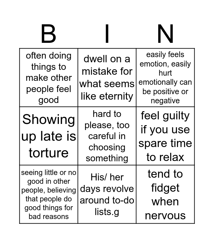 This bingo card has 9 words: seeing little or no good in other people, believing that people do good things for bad reasons, hard to please, too careful in choosing something, easily feels emotion, easily hurt emotionally can be positive or negative, often doing things to make other people feel good, dwell on a mistake for what seems like eternity, feel guilty if you use spare time to relax, Showing up late is torture, His/ her days revolve around to-do lists.g and tend to fidget when nervous.