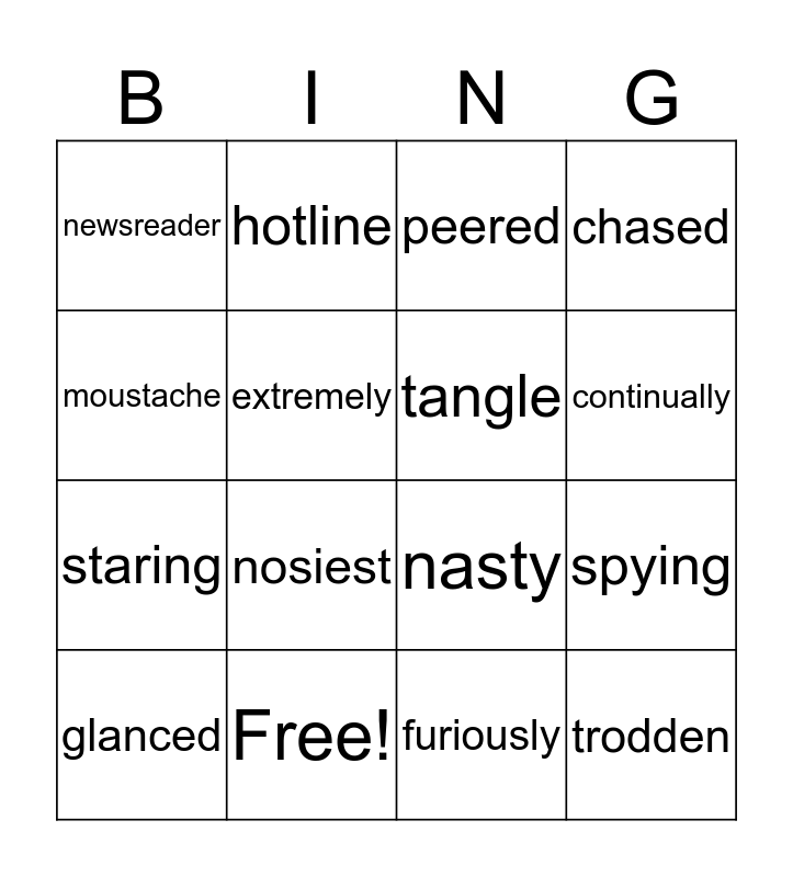 This bingo card has 25 words: orphan, wobbling, continually, beefy, moustache, newsreader, extremely, hotline, Free!, snorted, staring, nasty, annoyed, bony, tangle, tidy, furiously, peered, nosiest, spying, glanced, precious, trodden, chased and refused.