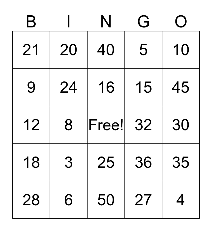This bingo card has a free space and 24 words: 3, 6, 16, 28, 10, 21, 9, 20, 32, 25, 15, 12, 36, 35, 24, 27, 30, 40, 45, 8, 4, 18, 5 and 50.
