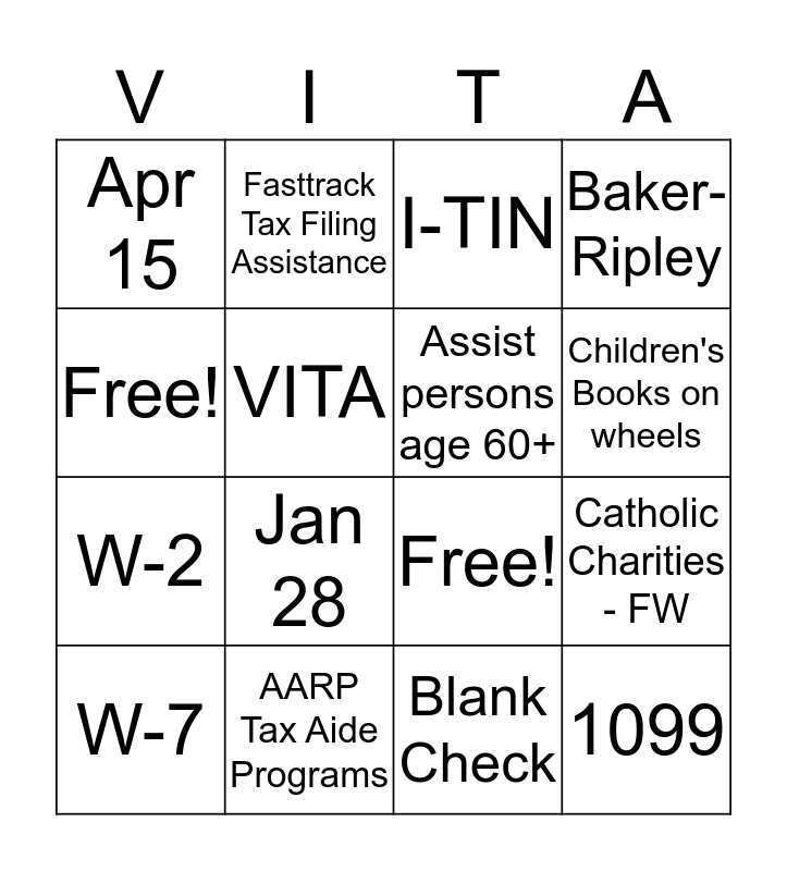 This bingo card has 16 words: AARP Tax Aide Programs, Catholic Charities - FW, I-TIN, Apr 15, W-2, Fasttrack Tax Filing Assistance, Free!, Blank Check, Free!, VITA, W-7, Baker-Ripley, Jan 28, Children's Books on wheels, Assist persons age 60+ and 1099.