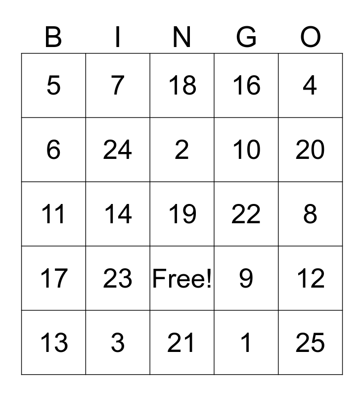 This bingo card has 26 words: Free!, 1, 2, 3, 4, 5, 6, 7, 8, 9, 10, 11, 12, 13, 14, 15, 16, 17, 18, 19, 20, 21, 22, 23, 24 and 25.