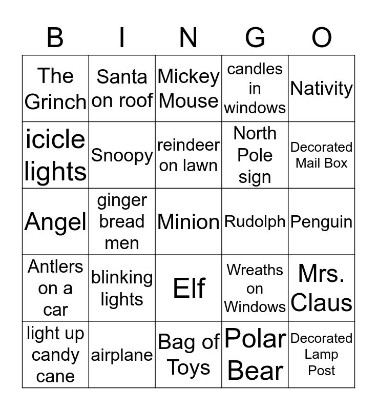 This bingo card has 30 words: airplane, snow globe, ginger bread men, train, The Grinch, Mickey Mouse, Snoopy, Elf, Rudolph, Bag of Toys, Penguin, Minion, Polar Bear, Decorated Lamp Post, Decorated Mail Box, Toy Soldier, Wreaths on Windows, Antlers on a car, blinking lights, Nativity, Angel, Santa in Sleigh, Santa on roof, North Pole sign, icicle lights, candles in windows, Mrs. Claus, light up candy cane, reindeer on lawn and stocking.