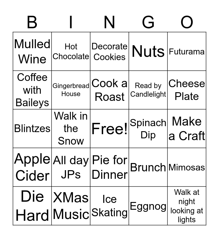 This bingo card has a free space and 24 words: All day JPs, XMas Music, Cook a Roast, Die Hard, Futurama, Mulled Wine, Coffee with Baileys, Hot Chocolate, Spinach Dip, Pie for Dinner, Read by Candlelight, Blintzes, Brunch, Mimosas, Gingerbread House, Eggnog, Make a Craft, Decorate Cookies, Cheese Plate, Walk in the Snow, Walk at night looking at lights, Apple Cider, Nuts and Ice Skating.