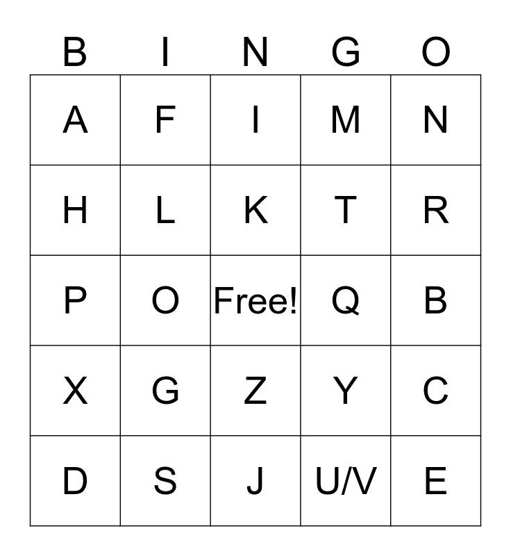 This bingo card has a free space and 24 words: G, S, K, D, N, A, H, F, Q, Z, T, P, Y, C, L, U/V, B, I, R, O, E, X, M and J.