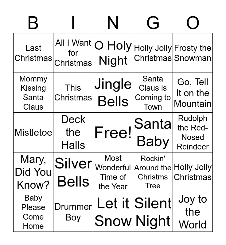 This bingo card has a free space and 24 words: Silver Bells, Drummer Boy, Jingle Bells, Baby Please Come Home, Frosty the Snowman, Last Christmas, Mommy Kissing Santa Claus, All I Want for Christmas, Santa Baby, Most Wonderful Time of the Year, Santa Claus is Coming to Town, Mistletoe, Rockin' Around the Christms Tree, Holly Jolly Christmas, This Christmas, Silent Night, Rudolph the Red-Nosed Reindeer, O Holy Night, Go, Tell It on the Mountain, Deck the Halls, Joy to the World, Mary, Did You Know?, Holly Jolly Christmas and Let it Snow.