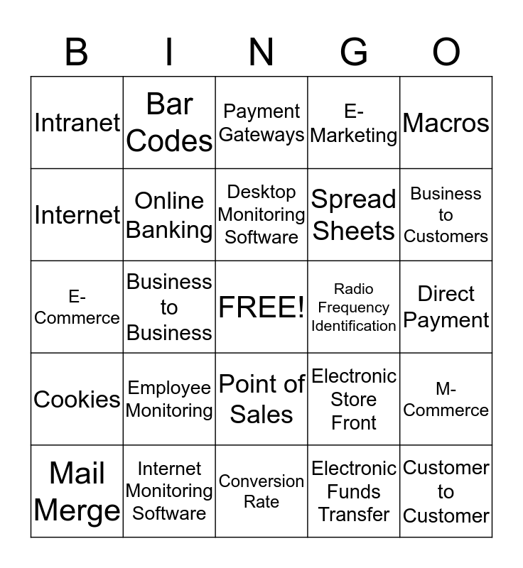 This bingo card has a free space and 24 words: Employee Monitoring, Internet Monitoring Software, Desktop Monitoring Software, Mail Merge, Macros, Intranet, Internet, Bar Codes, Radio Frequency Identification, Point of Sales, Spread Sheets, E-Commerce, Electronic Store Front, M-Commerce, Online Banking, Electronic Funds Transfer, Direct Payment, Payment Gateways, Business to Customers, Business to Business, Customer to Customer, Cookies, E-Marketing and Conversion Rate.