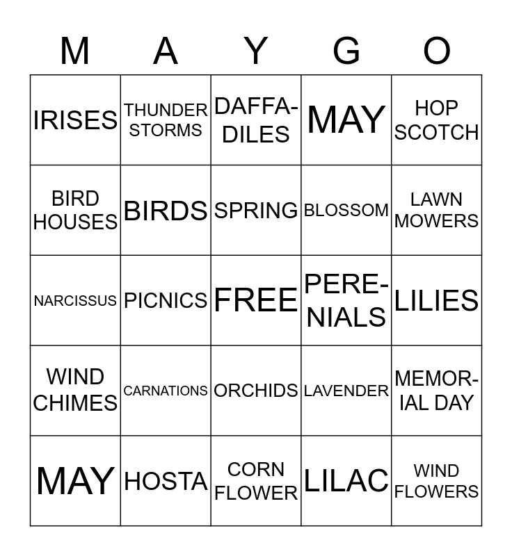This bingo card has a free space and 61 words: BUTTER- FLIES, HOSTA, BEES, WIND CHIMES, LILAC, GARDENS, BIRDS, TULIP, BLOSSOM, BASEBALL, MAY, PEREN- IALS, BIRD HOUSES, GER- ANIAMS, HUMMING BIRDS, IRISES, WIND FLOWERS, HOP SCOTCH, BIKE RIDING, SPRING, PERE- NIALS, DAFFA- DILES, MAY, MEMOR- IAL DAY, BUBBLES, WALKING, SUN SHINE, JUMP ROPE, LAWN MOWERS, GRASS, WEEDS, ROBINS, CARDINALS, GARDENING GLOVES, THUNDER STORMS, HIKING, CAMPING, PICNICS, HYDRANGEA, NARCISSUS, FREESIA, CARNATIONS, LILIES, BEGONIA, LAVENDER, GERBERAS, CROCUS, IRIS, ROSES, ORCHIDS, CORN FLOWER, TIGER LILY, HIBISCUS, FISHING, BOATING, VIOLETS, DAISIES, RAIN COAT, SOCCER, KITES and UMBRELLA.