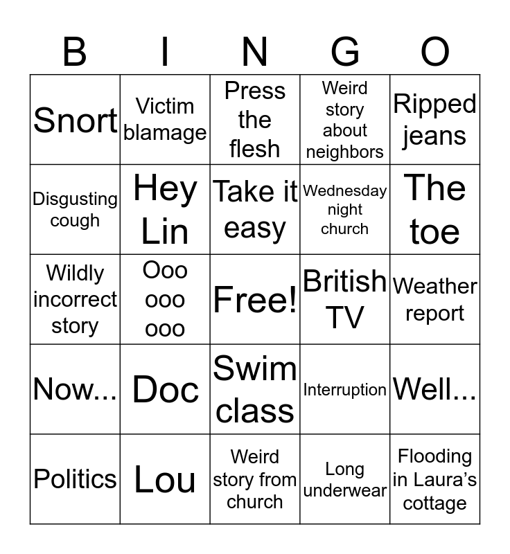 This bingo card has a free space and 24 words: Doc, Lou, Take it easy, Politics, Ripped jeans, Snort, Disgusting cough, Victim blamage, British TV, Swim class, Wednesday night church, Wildly incorrect story, Interruption, Well..., Hey Lin, Long underwear, Weather report, Press the flesh, The toe, Ooo ooo ooo, Flooding in Laura’s cottage, Now..., Weird story about neighbors and Weird story from church.