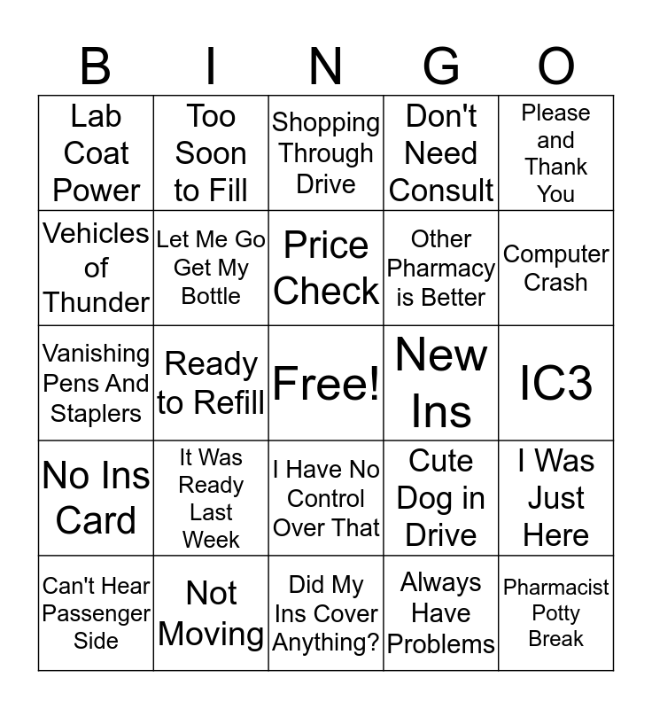 This bingo card has a free space and 24 words: It Was Ready Last Week, Not Moving, Price Check, Can't Hear Passenger Side, Please and Thank You, Lab Coat Power, Vehicles of Thunder, Too Soon to Fill, New Ins, I Have No Control Over That, Other Pharmacy is Better, Vanishing Pens And Staplers, Cute Dog in Drive, I Was Just Here, Let Me Go Get My Bottle, Always Have Problems, IC3, Shopping Through Drive, Computer Crash, Ready to Refill, Pharmacist Potty Break, No Ins Card, Don't Need Consult and Did My Ins Cover Anything?.