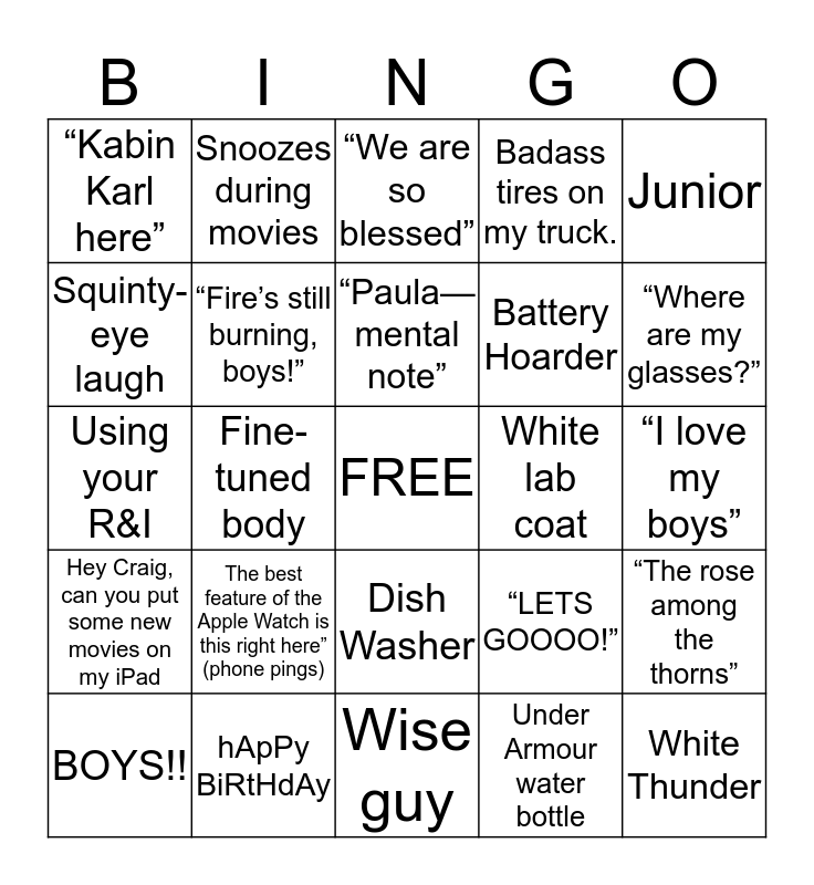 This bingo card has a free space and 24 words: The best feature of the Apple Watch is this right here” (phone pings), hApPy BiRtHdAy, “Paula—mental note”, BOYS!!, Junior, “Kabin Karl here”, Squinty-eye laugh, Snoozes during movies, White lab coat, Dish Washer, Battery Hoarder, Using your R&I, “LETS GOOOO!”, “The rose among the thorns”, “Fire’s still burning, boys!”, Under Armour water bottle, “I love my boys”, “We are so blessed”, “Where are my glasses?”, Fine-tuned body, White Thunder, Hey Craig, can you put some new movies on my iPad, Badass tires on my truck. and Wise guy.