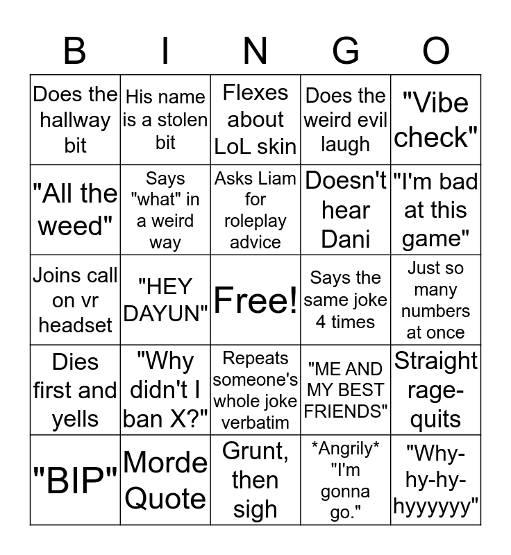 This bingo card has a free space and 24 words: "Why didn't I ban X?", Morde Quote, Asks Liam for roleplay advice, "BIP", "Vibe check", Does the hallway bit, "All the weed", His name is a stolen bit, Says the same joke 4 times, Repeats someone's whole joke verbatim, Doesn't hear Dani, Joins call on vr headset, "ME AND MY BEST FRIENDS", Straight rage-quits, Says "what" in a weird way, *Angrily* "I'm gonna go.", Just so many numbers at once, Flexes about LoL skin, "I'm bad at this game", "HEY DAYUN", "Why-hy-hy-hyyyyyy", Dies first and yells, Does the weird evil laugh and Grunt, then sigh.