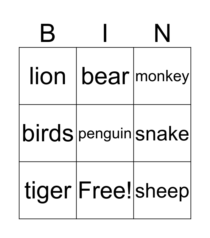 This bingo card has 9 words: tiger, monkey, bear, birds, lion, snake, penguin, sheep and Free!.
