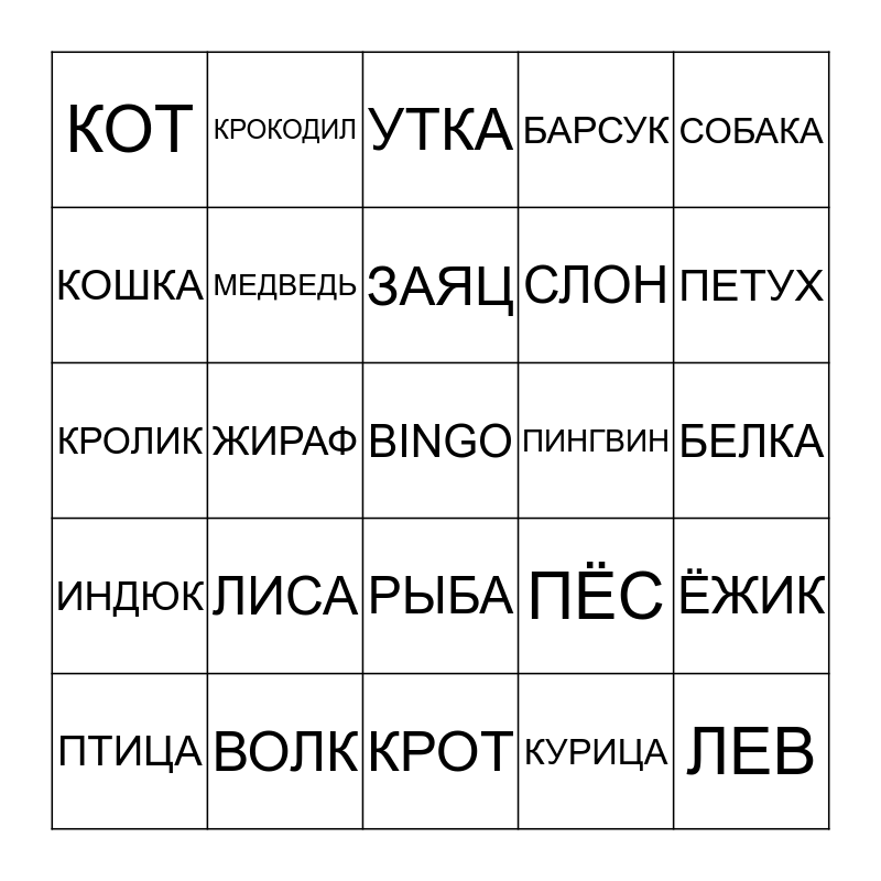 This bingo card has a free space and 24 words: ЛИСА, ВОЛК, ЗАЯЦ, ПТИЦА, СОБАКА, КОТ, КОШКА, КРОКОДИЛ, ПИНГВИН, РЫБА, СЛОН, КРОЛИК, ПЁС, ЁЖИК, МЕДВЕДЬ, КУРИЦА, БЕЛКА, УТКА, ПЕТУХ, ЖИРАФ, ЛЕВ, ИНДЮК, БАРСУК and КРОТ.