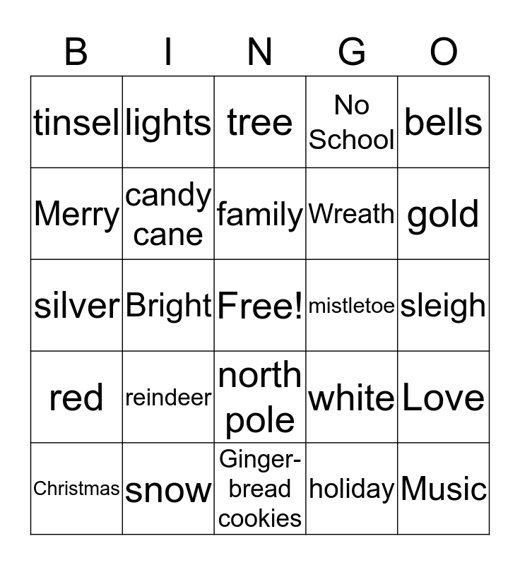 This bingo card has a free space and 34 words: Santa, holiday, winter, presents, red, candy cane, bells, Christmas, lights, green, family, tree, elf, vacation, mistletoe, gold, snow, silver, reindeer, white, north pole, December, tinsel, sleigh, Ginger- bread cookies, Music, No School, Turkey Dinner, Wreath, Merry, Happy, Bright, Love and Christmas Eve.