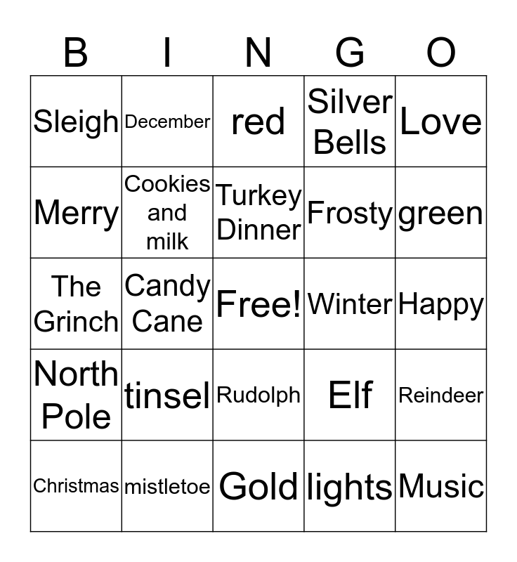 This bingo card has a free space and 24 words: tinsel, mistletoe, Turkey Dinner, Christmas, Love, Sleigh, Merry, December, Winter, Rudolph, Frosty, The Grinch, Elf, Reindeer, Cookies and milk, lights, Happy, red, green, Candy Cane, Music, North Pole, Silver Bells and Gold.