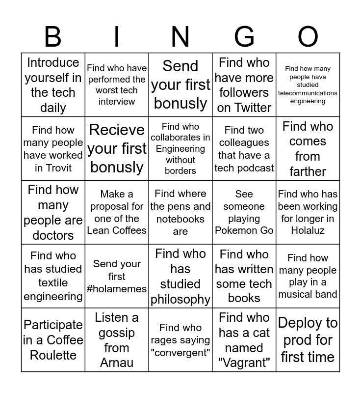 This bingo card has 29 words: Participate in a Coffee Roulette, Participate in an HolaClientes, Make a proposal for one of the Lean Coffees, Deploy to prod for first time, Introduce yourself in the tech daily, Send your first bonusly, Recieve your first bonusly, Send your first #holamemes, See someone playing Pokemon Go, Listen a gossip from Arnau, Find who has been working for longer in Holaluz, Find where the pens and notebooks are, Find who rages saying "convergent", Find who has a cat named "Vagrant", Find who comes from farther, Find who comes with a fuller shared car, Find who has studied philosophy, Find who has studied textile engineering, Find how many people have studied telecommunications engineering, Find how many people are doctors, Find who has written some tech books, Find who refuses to have an Slack picture, Find two colleagues that have a tech podcast, Find how many people have worked in Trovit, Find who have more followers on Twitter, Find who have performed the worst tech interview, Find how many people play in a musical band, Find who collaborates in Engineering without borders and Find the last person that have had a baby.