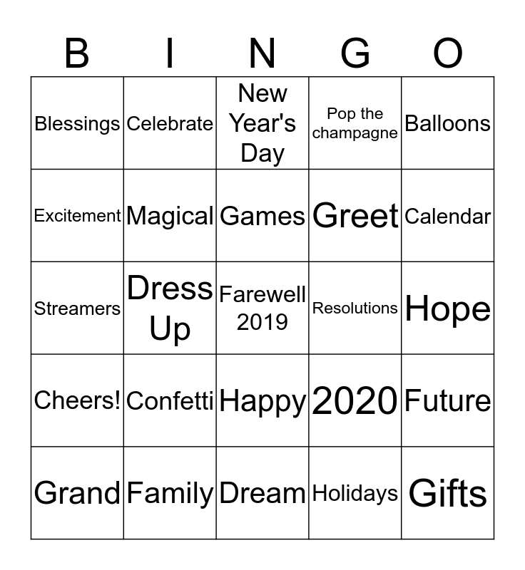 This bingo card has 25 words: Confetti, Dream, Games, Grand, Balloons, Blessings, Excitement, Celebrate, Resolutions, Happy, Greet, Streamers, 2020, Future, Magical, Gifts, Hope, New Year's Day, Calendar, Dress Up, Farewell 2019, Family, Cheers!, Pop the champagne and Holidays.