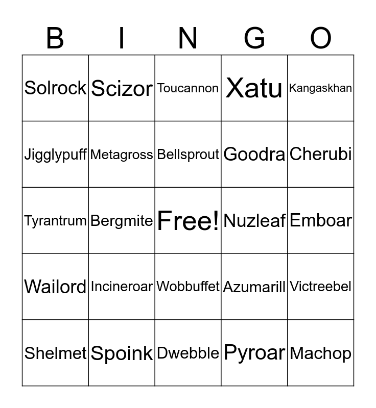 This bingo card has a free space and 727 words: Bulbasaur, Ivysaur, Venusaur, Charmander, Charmeleon, Charizard, Squirtle, Wartortle, Blastoise, Caterpie, Metapod, Butterfree, Weedle, Kakuna, Beedrill, Pidgey, Pidgeotto, Pidgeot, Rattata, Raticate, Spearow, Fearow, Ekans, Arbok, Pikachu, Raichu, Sandshrew, Sandslash, Nidoran♀, Nidorina, Nidoqueen, Nidoran♂, Nidorino, Nidoking, Clefairy, Clefable, Vulpix, Ninetales, Jigglypuff, Wigglytuff, Zubat, Golbat, Oddish, Gloom, Vileplume, Paras, Parasect, Venonat, Venomoth, Diglett, Dugtrio, Meowth, Persian, Psyduck, Golduck, Mankey, Primeape, Growlithe, Arcanine, Poliwag, Poliwhirl, Poliwrath, Abra, Kadabra, Alakazam, Machop, Machoke, Machamp, Bellsprout, Weepinbell, Victreebel, Tentacool, Tentacruel, Geodude, Graveler, Golem, Ponyta, Rapidash, Slowpoke, Slowbro, Magnemite, Magneton, Farfetch’d, Doduo, Dodrio, Seel, Dewgong, Grimer, Muk, Shellder, Cloyster, Gastly, Haunter, Gengar, Onix, Drowzee, Hypno, Krabby, Kingler, Voltorb, Electrode, Exeggcute, Exeggutor, Cubone, Marowak, Hitmonlee, Hitmonchan, Lickitung, Koffing, Weezing, Rhyhorn, Rhydon, Chansey, Tangela, Kangaskhan, Horsea, Seadra, Goldeen, Seaking, Staryu, Starmie, Mr. Mime, Scyther, Jynx, Electabuzz, Magmar, Pinsir, Tauros, Magikarp, Gyarados, Lapras, Ditto, Eevee, Vaporeon, Jolteon, Flareon, Porygon, Omanyte, Omastar, Kabuto, Kabutops, Aerodactyl, Snorlax, Dratini, Dragonair, Dragonite, Chikorita, Bayleef, Meganium, Cyndaquil, Quilava, Typhlosion, Totodile, Croconaw, Feraligatr, Sentret, Furret, Hoothoot, Noctowl, Ledyba, Ledian, Spinarak, Ariados, Crobat, Chinchou, Lanturn, Pichu, Cleffa, Igglybuff, Togepi, Togetic, Natu, Xatu, Mareep, Flaaffy, Ampharos, Bellossom, Marill, Azumarill, Sudowoodo, Politoed, Hoppip, Skiploom, Jumpluff, Aipom, Sunkern, Sunflora, Yanma, Wooper, Quagsire, Espeon, Umbreon, Murkrow, Slowking, Misdreavus, Unown, Wobbuffet, Girafarig, Pineco, Forretress, Dunsparce, Gligar, Steelix, Snubbull, Granbull, Qwilfish, Scizor, Shuckle, Heracross, Sneasel, Teddiursa, Ursaring, Slugma, Magcargo, Swinub, Piloswine, Corsola, Remoraid, Octillery, Delibird, Mantine, Skarmory, Houndour, Houndoom, Kingdra, Phanpy, Donphan, Porygon2, Stantler, Smeargle, Tyrogue, Hitmontop, Smoochum, Elekid, Magby, Miltank, Blissey, Larvitar, Pupitar, Tyranitar, Treecko, Grovyle, Sceptile, Torchic, Combusken, Blaziken, Mudkip, Marshtomp, Swampert, Poochyena, Mightyena, Zigzagoon, Linoone, Wurmple, Silcoon, Beautifly, Cascoon, Dustox, Lotad, Lombre, Ludicolo, Seedot, Nuzleaf, Shiftry, Taillow, Swellow, Wingull, Pelipper, Ralts, Kirlia, Gardevoir, Surskit, Masquerain, Shroomish, Breloom, Slakoth, Vigoroth, Slaking, Nincada, Ninjask, Shedinja, Whismur, Loudred, Exploud, Makuhita, Hariyama, Azurill, Nosepass, Skitty, Delcatty, Sableye, Mawile, Aron, Lairon, Aggron, Meditite, Medicham, Electrike, Manectric, Plusle, Minun, Volbeat, Illumise, Roselia, Gulpin, Swalot, Carvanha, Sharpedo, Wailmer, Wailord, Numel, Camerupt, Torkoal, Spoink, Grumpig, Spinda, Trapinch, Vibrava, Flygon, Cacnea, Cacturne, Swablu, Altaria, Zangoose, Seviper, Lunatone, Solrock, Barboach, Whiscash, Corphish, Crawdaunt, Baltoy, Claydol, Lileep, Cradily, Anorith, Armaldo, Feebas, Milotic, Castform, Kecleon, Shuppet, Banette, Duskull, Dusclops, Tropius, Chimecho, Absol, Wynaut, Snorunt, Glalie, Spheal, Sealeo, Walrein, Clamperl, Huntail, Gorebyss, Relicanth, Luvdisc, Bagon, Shelgon, Salamence, Beldum, Metang, Metagross, Turtwig, Grotle, Torterra, Chimchar, Monferno, Infernape, Piplup, Prinplup, Empoleon, Starly, Staravia, Staraptor, Bidoof, Bibarel, Kricketot, Kricketune, Shinx, Luxio, Luxray, Budew, Roserade, Cranidos, Rampardos, Shieldon, Bastiodon, Burmy, Wormadam, Mothim, Combee, Vespiquen, Pachirisu, Buizel, Floatzel, Cherubi, Cherrim, Shellos, Gastrodon, Ambipom, Drifloon, Drifblim, Buneary, Lopunny, Mismagius, Honchkrow, Glameow, Purugly, Chingling, Stunky, Skuntank, Bronzor, Bronzong, Bonsly, Mime Jr., Happiny, Chatot, Spiritomb, Gible, Gabite, Garchomp, Munchlax, Riolu, Lucario, Hippopotas, Hippowdon, Skorupi, Drapion, Croagunk, Toxicroak, Carnivine, Finneon, Lumineon, Mantyke, Snover, Abomasnow, Weavile, Magnezone, Lickilicky, Rhyperior, Tangrowth, Electivire, Magmortar, Togekiss, Yanmega, Leafeon, Glaceon, Gliscor, Mamoswine, Porygon-Z, Gallade, Probopass, Dusknoir, Froslass, Snivy, Servine, Serperior, Tepig, Pignite, Emboar, Oshawott, Dewott, Samurott, Patrat, Watchog, Lillipup, Herdier, Stoutland, Purrloin, Liepard, Pansage, Simisage, Pansear, Simisear, Panpour, Simipour, Munna, Musharna, Pidove, Tranquill, Unfezant, Blitzle, Zebstrika, Roggenrola, Boldore, Gigalith, Woobat, Swoobat, Drilbur, Excadrill, Audino, Timburr, Gurdurr, Conkeldurr, Tympole, Palpitoad, Seismitoad, Throh, Sawk, Sewaddle, Swadloon, Leavanny, Venipede, Whirlipede, Scolipede, Cottonee, Whimsicott, Petilil, Lilligant, Basculin, Sandile, Krokorok, Krookodile, Darumaka, Darmanitan, Maractus, Dwebble, Crustle, Scraggy, Scrafty, Sigilyph, Yamask, Cofagrigus, Tirtouga, Carracosta, Archen, Archeops, Trubbish, Garbodor, Zorua, Zoroark, Minccino, Cinccino, Gothita, Gothorita, Gothitelle, Solosis, Duosion, Reuniclus, Ducklett, Swanna, Vanillite, Vanillish, Vanilluxe, Deerling, Sawsbuck, Emolga, Karrablast, Escavalier, Foongus, Amoonguss, Frillish, Jellicent, Alomomola, Joltik, Galvantula, Ferroseed, Ferrothorn, Klink, Klang, Klinklang, Tynamo, Eelektrik, Eelektross, Elgyem, Beheeyem, Litwick, Lampent, Chandelure, Axew, Fraxure, Haxorus, Cubchoo, Beartic, Cryogonal, Shelmet, Accelgor, Stunfisk, Mienfoo, Mienshao, Druddigon, Golett, Golurk, Pawniard, Bisharp, Bouffalant, Rufflet, Braviary, Vullaby, Mandibuzz, Heatmor, Durant, Deino, Zweilous, Hydreigon, Larvesta, Volcarona, Chespin, Quilladin, Chesnaught, Fennekin, Braixen, Delphox, Froakie, Frogadier, Greninja, Bunnelby, Diggersby, Fletchling, Fletchinder, Talonflame, Scatterbug, Spewpa, Vivillon, Litleo, Pyroar, Flabébé, Floette, Florges, Skiddo, Gogoat, Pancham, Pangoro, Furfrou, Espurr, Meowstic, H