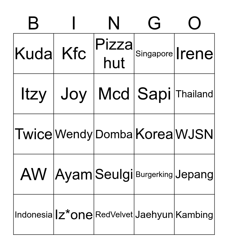 This bingo card has 25 words: Ayam, RedVelvet, Mcd, Indonesia, Irene, Kuda, Itzy, Kfc, Korea, Seulgi, Sapi, Twice, Burgerking, Jepang, Joy, Kambing, WJSN, Pizza hut, Thailand, Wendy, Domba, Iz*one, AW, Singapore and Jaehyun.