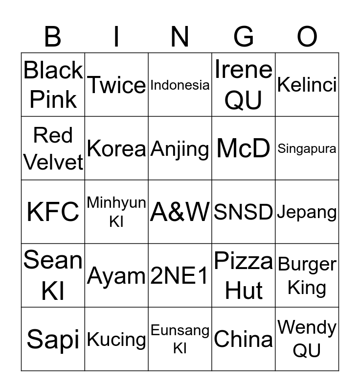 This bingo card has a free space and 24 words: Ayam, Kucing, Anjing, Sapi, Kelinci, Black Pink, Red Velvet, Twice, SNSD, 2NE1, McD, KFC, Pizza Hut, Burger King, Korea, China, Jepang, Indonesia, Singapura, Minhyun KI, Wendy QU, Sean KI, Irene QU and Eunsang KI.