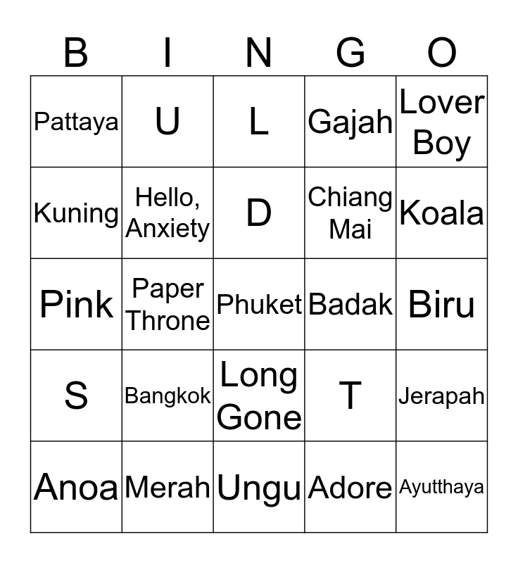 This bingo card has 25 words: Bangkok, Ungu, D, Anoa, Lover Boy, Pattaya, Kuning, U, Badak, Long Gone, Chiang Mai, Pink, T, Jerapah, Hello, Anxiety, Ayutthaya, Biru, L, Koala, Paper Throne, Phuket, Merah, S, Gajah and Adore.