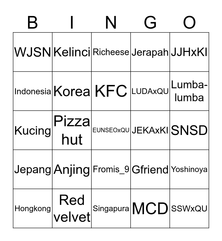 This bingo card has a free space and 24 words: Anjing, Red velvet, KFC, Hongkong, JJHxKI, WJSN, Indonesia, Kelinci, JEKAxKI, Fromis_9, LUDAxQU, Kucing, Gfriend, Yoshinoya, Korea, MCD, SNSD, Richeese, Lumba-lumba, Pizza hut, SSWxQU, Jepang, Jerapah and Singapura.