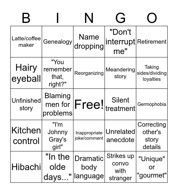 This bingo card has a free space and 24 words: "I'm Johnny Gray's girl", "In the olde days...", Reorganizing, Hibachi, Retirement, Latte/coffee maker, Hairy eyeball, Genealogy, Silent treatment, Inappropriate joke/comment, Meandering story, Unfinished story, Unrelated anecdote, Correcting other's story details, "You remember that, right?", Strikes up convo with stranger, Germophobia, Name dropping, Taking sides/dividing loyalties, Blaming men for problems, "Unique" or "gourmet", Kitchen control, "Don't interrupt me" and Dramatic body language.