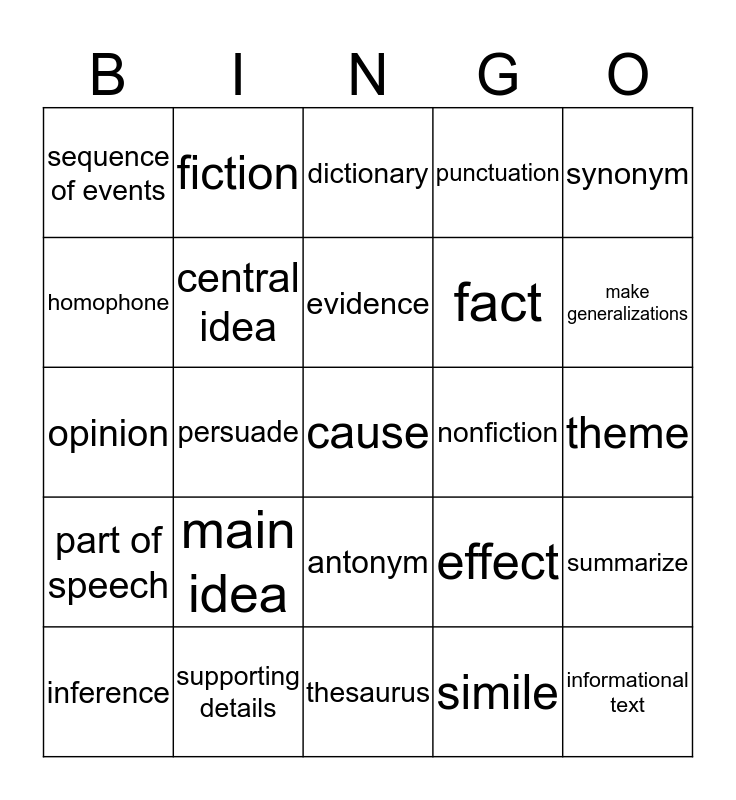 This bingo card has a free space and 24 words: main idea, supporting details, evidence, inference, synonym, sequence of events, homophone, fiction, nonfiction, antonym, fact, opinion, effect, summarize, central idea, simile, theme, dictionary, make generalizations, persuade, informational text, part of speech, punctuation and thesaurus.