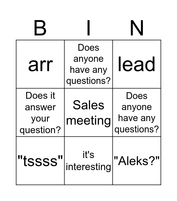 This bingo card has a free space and 10 words: it's interesting, lead, arr, "Aleks?", Does it answer your question?, "tssss", Does anyone have any questions?, Does it make sens?, Does anyone have any questions? and Does it answer your question?.