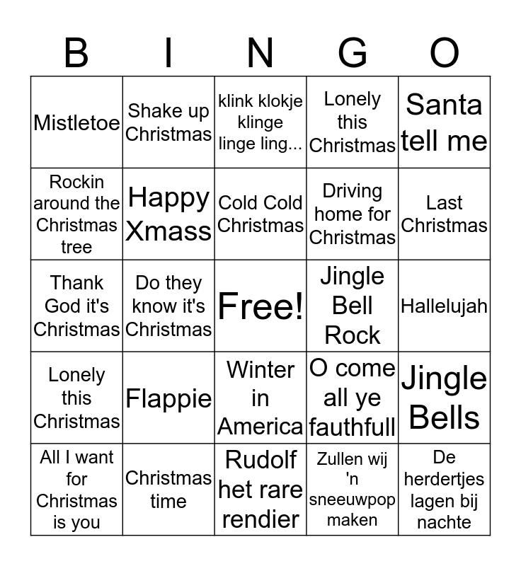 This bingo card has a free space and 30 words: Christmas time, Feliz Navidad, Do they know it's Christmas, Sleigh Bells, Mistletoe, klink klokje klinge linge ling..., Happy Xmass, Winter in America, Jingle Bell Rock, Rudolf het rare rendier, Hallelujah, De herdertjes lagen bij nachte, Zullen wij 'n sneeuwpop maken, Stop the Cavalry, Last Christmas, Let it snow, O come all ye fauthfull, Lonely this Christmas, Flappie, Santa tell me, Thank God it's Christmas, Het antwoord van Flappie, Shake up Christmas, Driving home for Christmas, Rockin around the Christmas tree, Lonely this Christmas, Jingle Bells, All I want for Christmas is you, Cold Cold Christmas and Santa Claus is comin'to town.