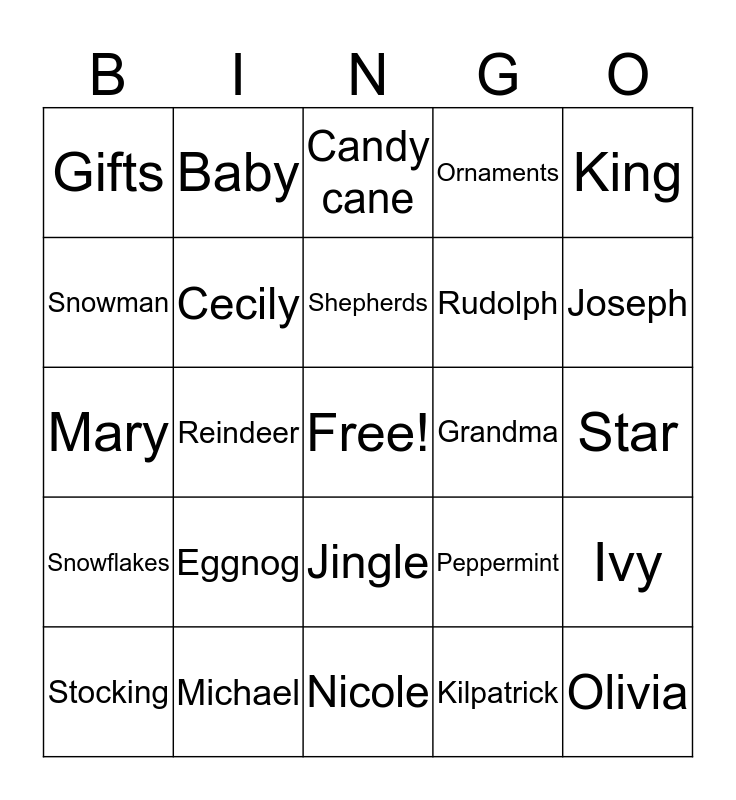 This bingo card has a free space and 68 words: Opp, Olivia, Nathan, Santa, Nativity, Manger, Baby, Noel, Shepherds, Holy, Jingle, Elf, Star, King, Angel, Snowman, Reindeer, Gifts, Presents, Eggnog, Rudolph, Peppermint, Snowflakes, Christmas tree, Carols, Bells, Wassail, Holly, Ivy, Tinsel, Candy cane, Scrooge, Humbug, Grinch, Ornaments, Nutcracker, Sugarplums, Stocking, Joseph, Mary, Jesus, Wreath, Cecily, Simeon, Emily, Cousin, Ashley, Mommy, Grandma, Michael, Larry, Josiah, Grandpa, Nicole, Micah, Uncle, Kilpatrick, Mash, Ryan, Ann, Everett, Natalie, Daddy, Stevie, Schluter, David, Aunt and Kristi.