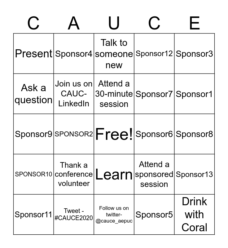 This bingo card has a free space and 24 words: Sponsor11, Thank a conference volunteer, Attend a 30-minute session, Sponsor5, Sponsor3, Present, Sponsor4, Talk to someone new, Sponsor6, Sponsor8, Sponsor9, Join us on CAUC- LinkedIn, Attend a sponsored session, Sponsor13, Ask a question, Tweet - #CAUCE2020, Follow us on twitter-@cauce_aepuc, Sponsor12, Sponsor1, SPONSOR10, SPONSOR2, Learn, Sponsor7 and Drink with Coral.