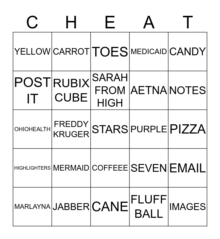 This bingo card has 35 words: SPACE CATS, SLOTH, FISH, RUBIX CUBE, COFFEEE, MEDICAID, POST IT, BALANCES, SARAH FROM HIGH, DECEMBER, OHIOHEALTH, CANDY, TECHNICAL, ESTIMATE, YELLOW, PURPLE, FLUFF BALL, FREDDY KRUGER, HIGHLIGHTERS, STARS, SEVEN, MARLAYNA, EMAIL, JABBER, TOES, NOTES, IMAGES, NEW PATIENT, AETNA, PIZZA, SLIPPERY, CANE, MERMAID, CARROT and KEYS.