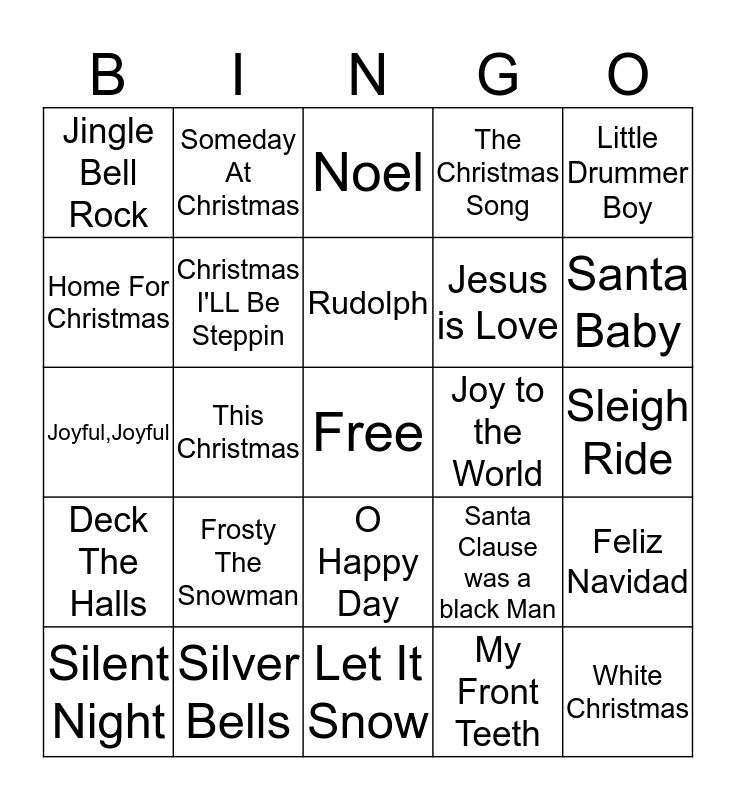 This bingo card has a free space and 25 words: Frosty The Snowman, Let It Snow, Rudolph, Silent Night, Little Drummer Boy, Jingle Bell Rock, Home For Christmas, Someday At Christmas, Joy to the World, O Happy Day, Jesus is Love, Joyful,Joyful, Santa Clause was a black Man, Feliz Navidad, Christmas I'LL Be Steppin, All I Want For Christmas, Sleigh Ride, Noel, Santa Baby, This Christmas, White Christmas, Silver Bells, Deck The Halls, The Christmas Song and My Front Teeth.