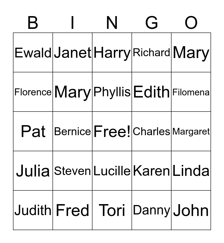 This bingo card has a free space and 65 words: Leydi, Mary, Pablo, Linda, Howard, David, Janet, Andi, Phyllis, Larissa, Lucille, Rosalio, Margaret, Mary, Kathleen, Florence, Bernice, Ewald, Ken, Edith, Steven, Julia, Richard, Fran, Anna, Margarot, Morgan, Cubbie, John, Richard, Judith, Candy, Kendra, Dave, Karen, Fred, Wayne, Pat, Danny, Jean, Mary, Ann, Charles, Violet, Wanda, Connie, Filomena, Bernard, Tom, Amanda, Becky, Karen, Elaine, Tori, John, Dan, Josephine, Harry, Jim, Cheryl, Martina, Naiquan, Jie, Wilfredo and Arvey.