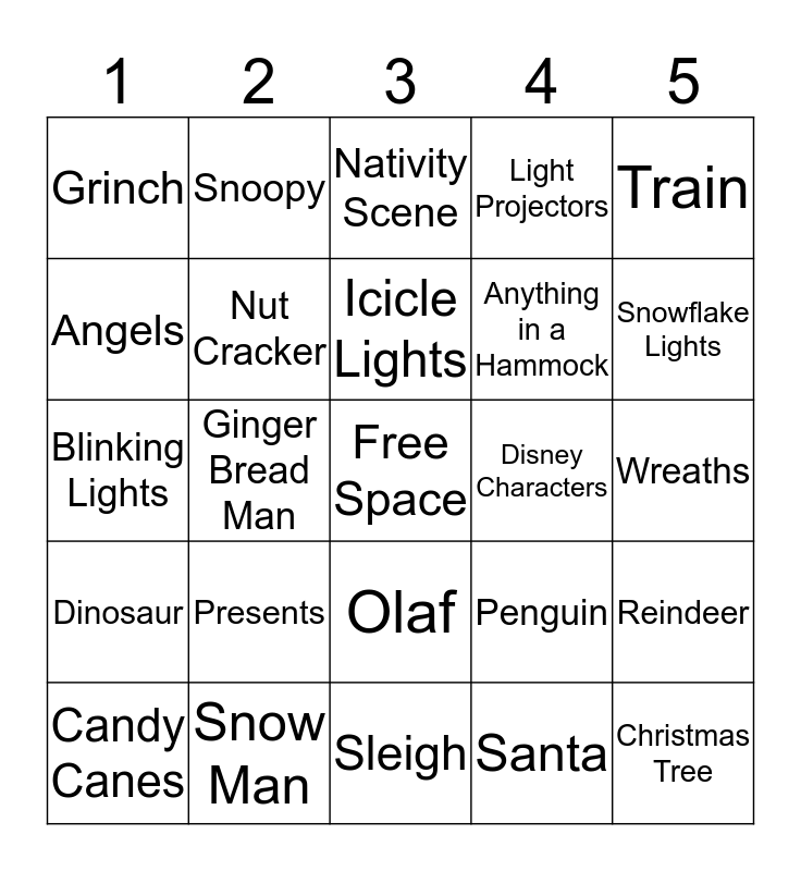This bingo card has a free space and 24 words: Candy Canes, Presents, Icicle Lights, Santa, Train, Grinch, Snoopy, Nativity Scene, Disney Characters, Wreaths, Blinking Lights, Nut Cracker, Penguin, Reindeer, Angels, Snow Man, Sleigh, Light Projectors, Snowflake Lights, Dinosaur, Ginger Bread Man, Olaf, Anything in a Hammock and Christmas Tree.