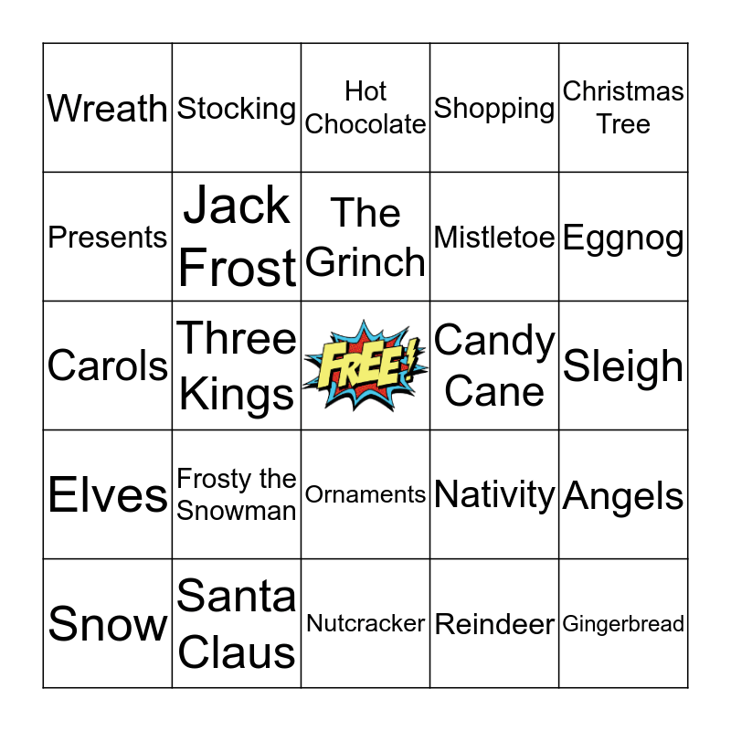 This bingo card has a free space and 24 words: Frosty the Snowman, Santa Claus, The Grinch, Snow, Christmas Tree, Wreath, Presents, Stocking, Candy Cane, Ornaments, Mistletoe, Carols, Nativity, Angels, Jack Frost, Reindeer, Sleigh, Hot Chocolate, Eggnog, Three Kings, Gingerbread, Elves, Shopping and Nutcracker.