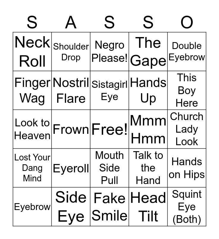 This bingo card has a free space and 24 words: Eyeroll, Side Eye, Sistagirl Eye, Eyebrow, Double Eyebrow, Neck Roll, Finger Wag, Shoulder Drop, Mmm Hmm, Mouth Side Pull, Hands Up, Look to Heaven, Talk to the Hand, Hands on Hips, Nostril Flare, Head Tilt, Church Lady Look, Negro Please!, This Boy Here, Frown, Squint Eye (Both), Lost Your Dang Mind, The Gape and Fake Smile.