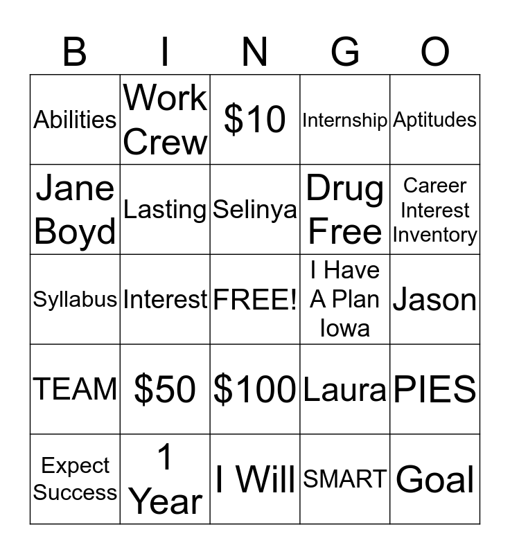 This bingo card has a free space and 24 words: $50, 1 Year, Selinya, Expect Success, Aptitudes, Abilities, Jane Boyd, Work Crew, I Have A Plan Iowa, $100, Drug Free, Syllabus, Laura, PIES, Lasting, SMART, Jason, $10, Career Interest Inventory, Interest, Goal, TEAM, Internship and I Will.