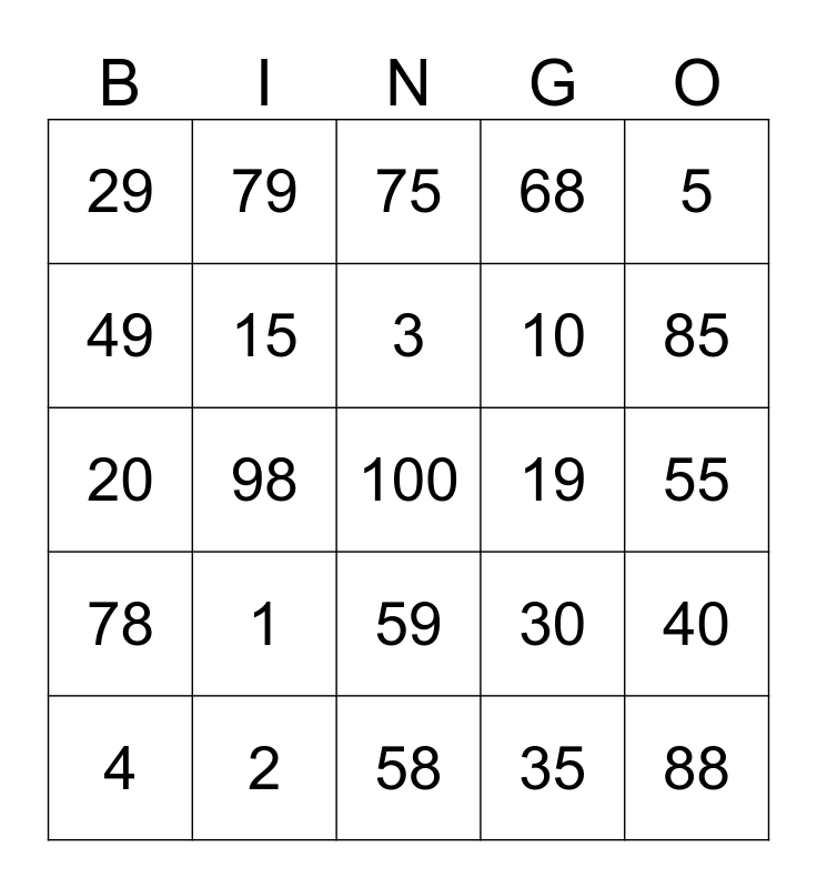 This bingo card has a free space and 24 words: 1, 2, 3, 4, 5, 29, 49, 79, 19, 59, 10, 20, 30, 40, 15, 35, 55, 75, 85, 98, 88, 78, 68 and 58.