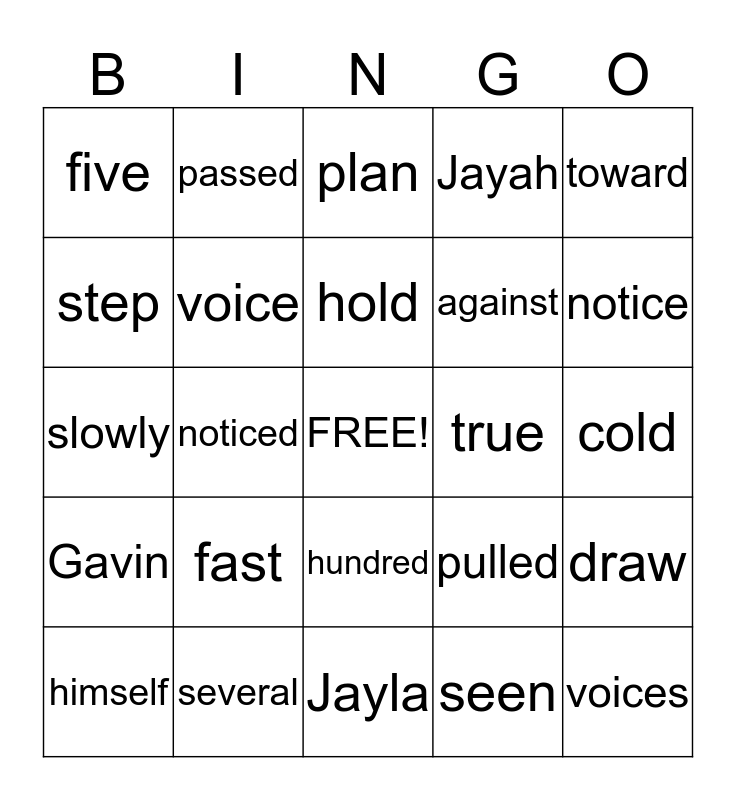 This bingo card has a free space and 24 words: fast, several, hold, himself, toward, five, step, passed, true, hundred, against, slowly, pulled, draw, voice, seen, cold, plan, notice, noticed, voices, Gavin, Jayah and Jayla.
