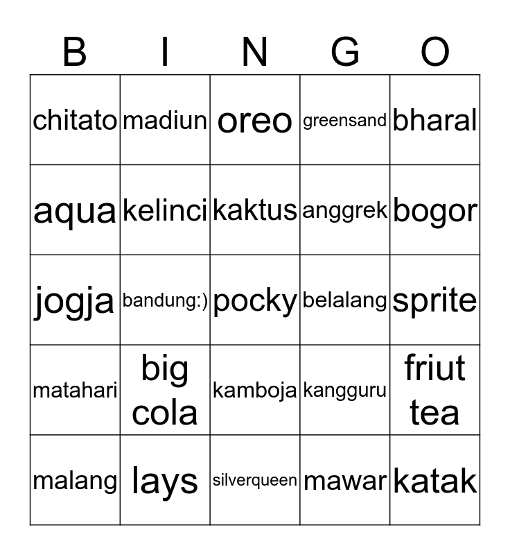 This bingo card has a free space and 24 words: big cola, lays, kaktus, malang, bharal, chitato, aqua, madiun, belalang, kamboja, anggrek, jogja, kangguru, friut tea, kelinci, mawar, sprite, oreo, bogor, bandung:), katak, matahari, greensand and silverqueen.