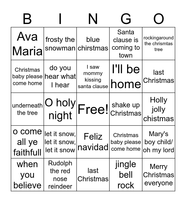This bingo card has a free space and 34 words: All I want for christmas, jingle bell rock, This Christmas, Hallelujah, o come all ye faithfull, do you hear what I hear, rockingaround the chrismtas tree, when you believe, frosty the snowman, Deck the halls, I saw mommy kissing santa clause, blue chirstmas, run run Rudolph, baby it's cold outside, shake up Christmas, last Christmas, Rudolph the red nose reindeer, underneath the tree, let it snow, let it snow, let it snow, Christmas baby please come home, Feliz navidad, oh come all ye faithfull, Ava Maria, Holly jolly chistmas, last Christmas, Merry Christmas everyone, Santa clause is coming to town, JOy to the world, I'll be home, Christmas baby please come home, Donner and Blitzend, O holy night, Mary's boy child/ oh my lord and Merry Christmas Happy Holidays.