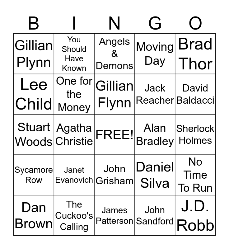 This bingo card has a free space and 29 words: Dan Brown, The Da Vinci Code, Agatha Christie, Gone Girl, Gillian Plynn, Angels & Demons, One for the Money, Janet Evanovich, Alan Bradley, The Cuckoo's Calling, Sherlock Holmes, J.D. Robb, James Patterson, John Sandford, David Baldacci, Stephen King, John Grisham, Sycamore Row, Brad Thor, Stuart Woods, Daniel Silva, The Heist, Jack Reacher, Lee Child, Moving Day, You Should Have Known, No Time To Run, Gillian Flynn and Shame On Me.
