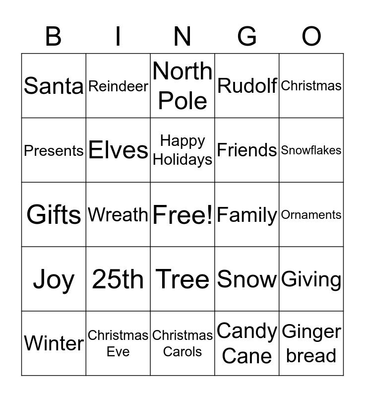 This bingo card has a free space and 24 words: 25th, Christmas Eve, Happy Holidays, Winter, Christmas, Santa, Presents, Reindeer, Family, Tree, Friends, Gifts, Snow, Giving, Elves, Candy Cane, Ornaments, North Pole, Snowflakes, Wreath, Ginger bread, Joy, Rudolf and Christmas Carols.