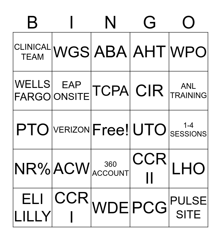 This bingo card has a free space and 64 words: 1-6 Sessions, Costco, BOA, LHO, MyStrength, ATS, WGS, CPSUI, TCPA, PROVIDER FINDER, 360 ACCOUNT, 800 999 7222, 1-4 SESSIONS, WPO, EAP WEBSITE, WELLS FARGO, VERIZON, CLINICAL TEAM, INTAKE STAFF, CIR, ACW, NR%, AHT, INBOUND CALLS, IT, ASK THE EXPERT, CHAT, CCPULSE, WFM, QA AUDITS, GOALS, AUDIT REVIEW, AEP, RA, ANL TRAINING, ELI LILLY, KL, PCG, WAH, EAP ONSITE, PTO, UTO, JANUARY OT, SKYPE, FOLLOW UP CALL, PULSE SITE, CCR I, CCR II, CCR II, OE, MANAGER, DIRECTOR, WDE, PSYCH TESTING, FAD, UM CALL, ABA, HRS, ACMP, REF #, PREFIX, IVR, ID # & GENDER and NPI/TAX ID.